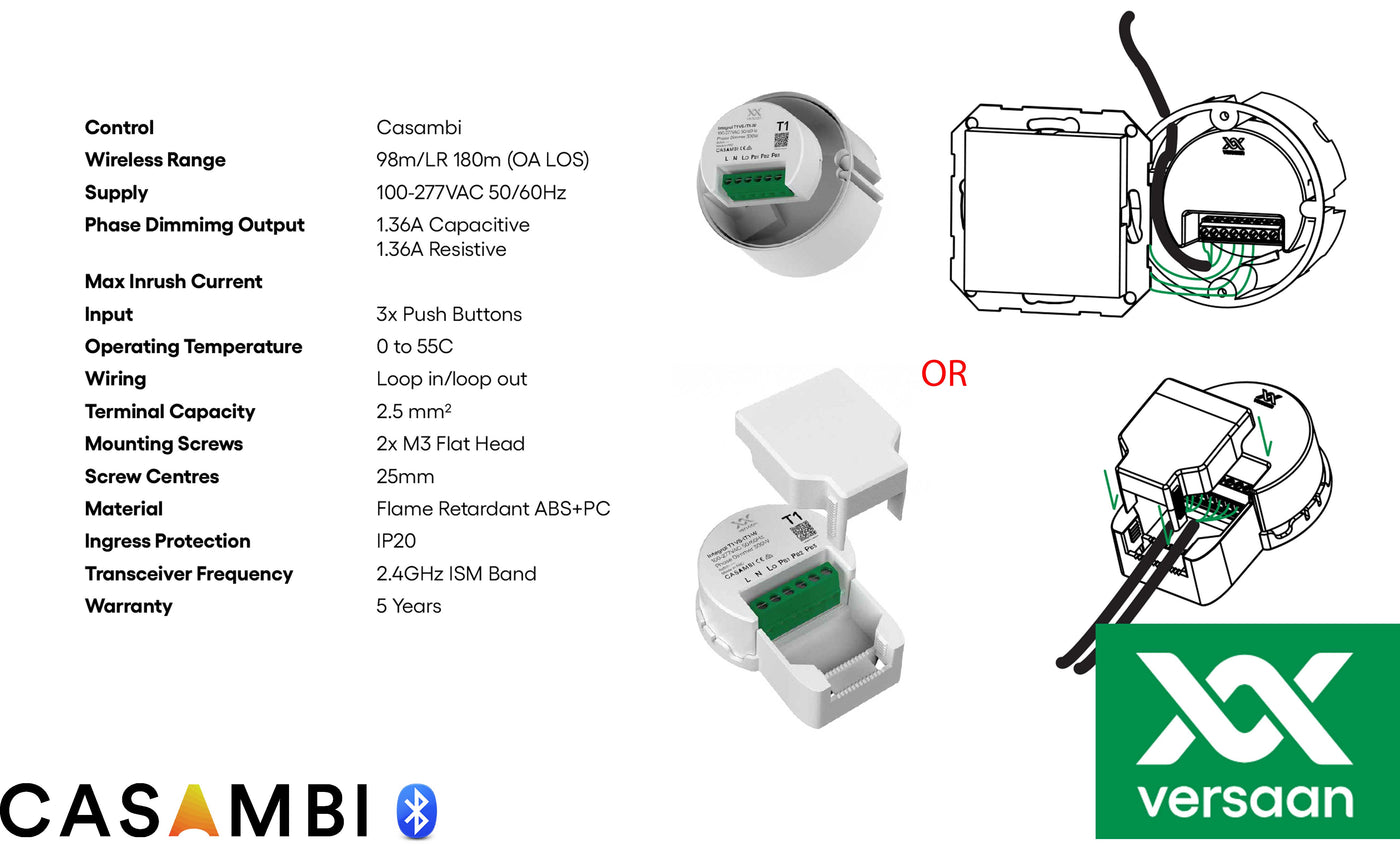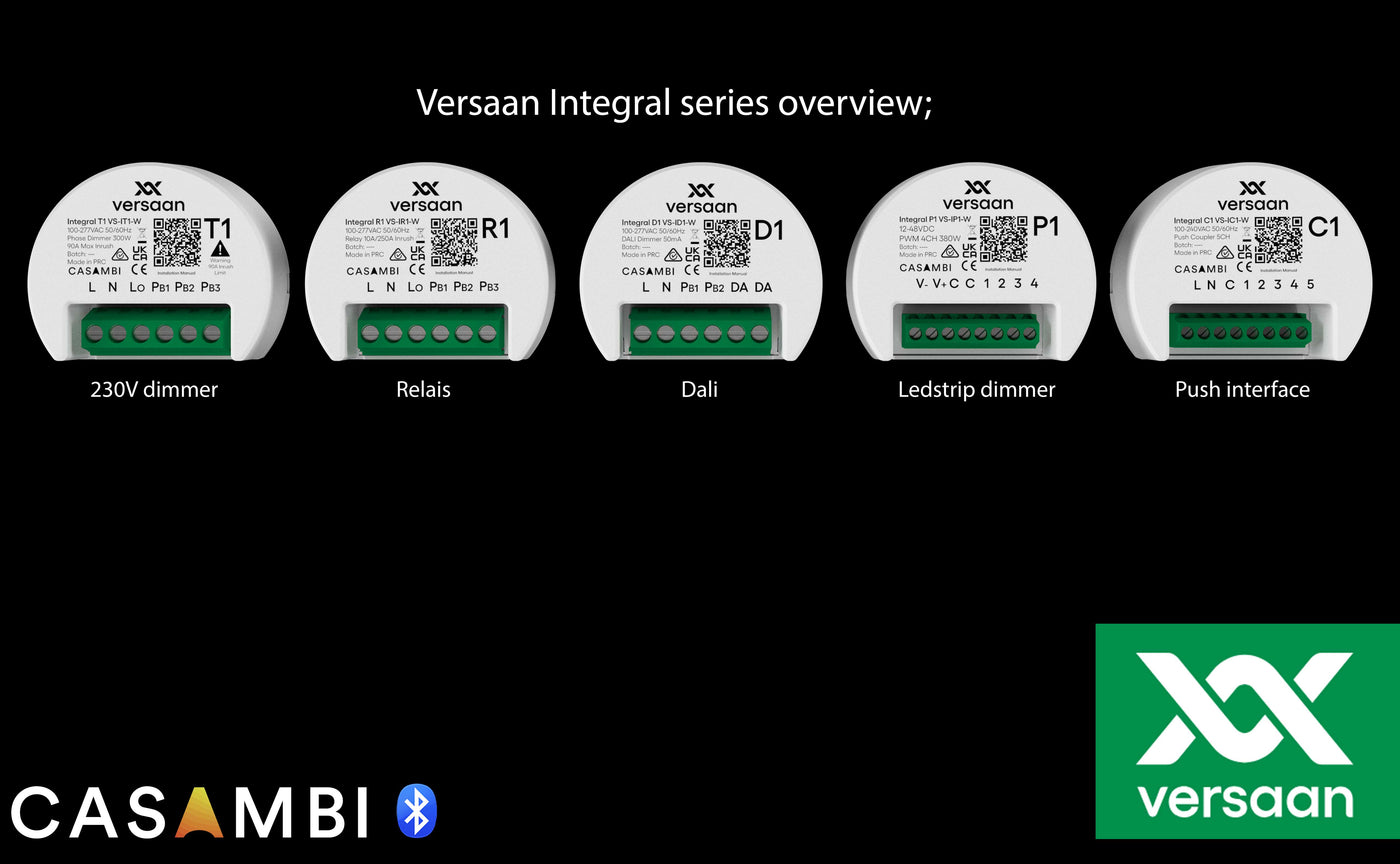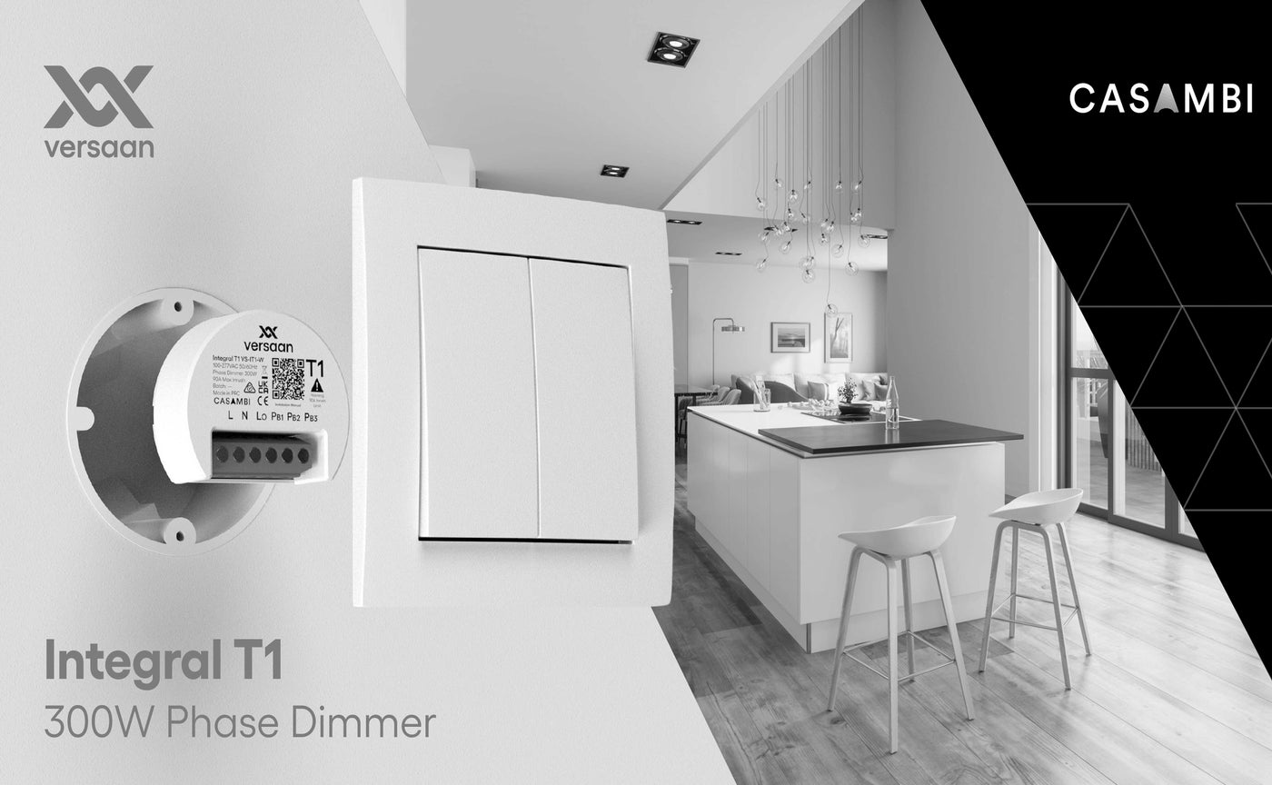 Uit een complete Versaan Casambi Integral serie is T1 een kleine 300VA inbouw trailing edge dimmer die bestand is tegen hoge aanloopstromen en over maar liefst over 3 impulsdrukker ingangen beschikt.