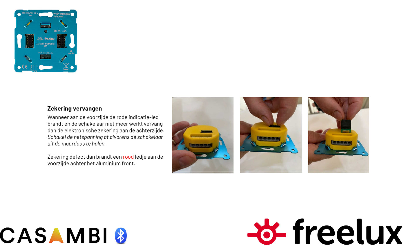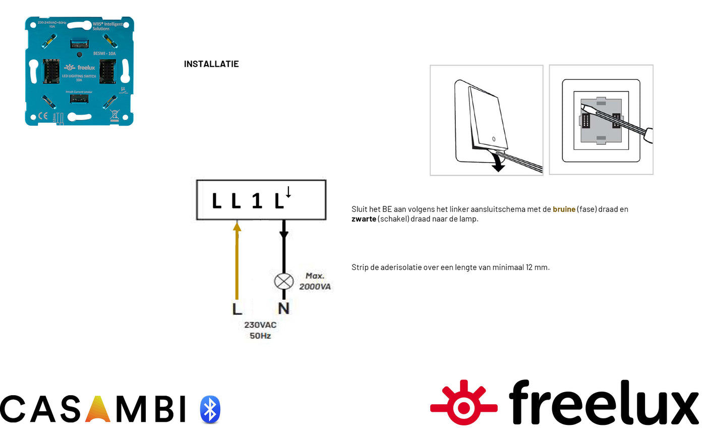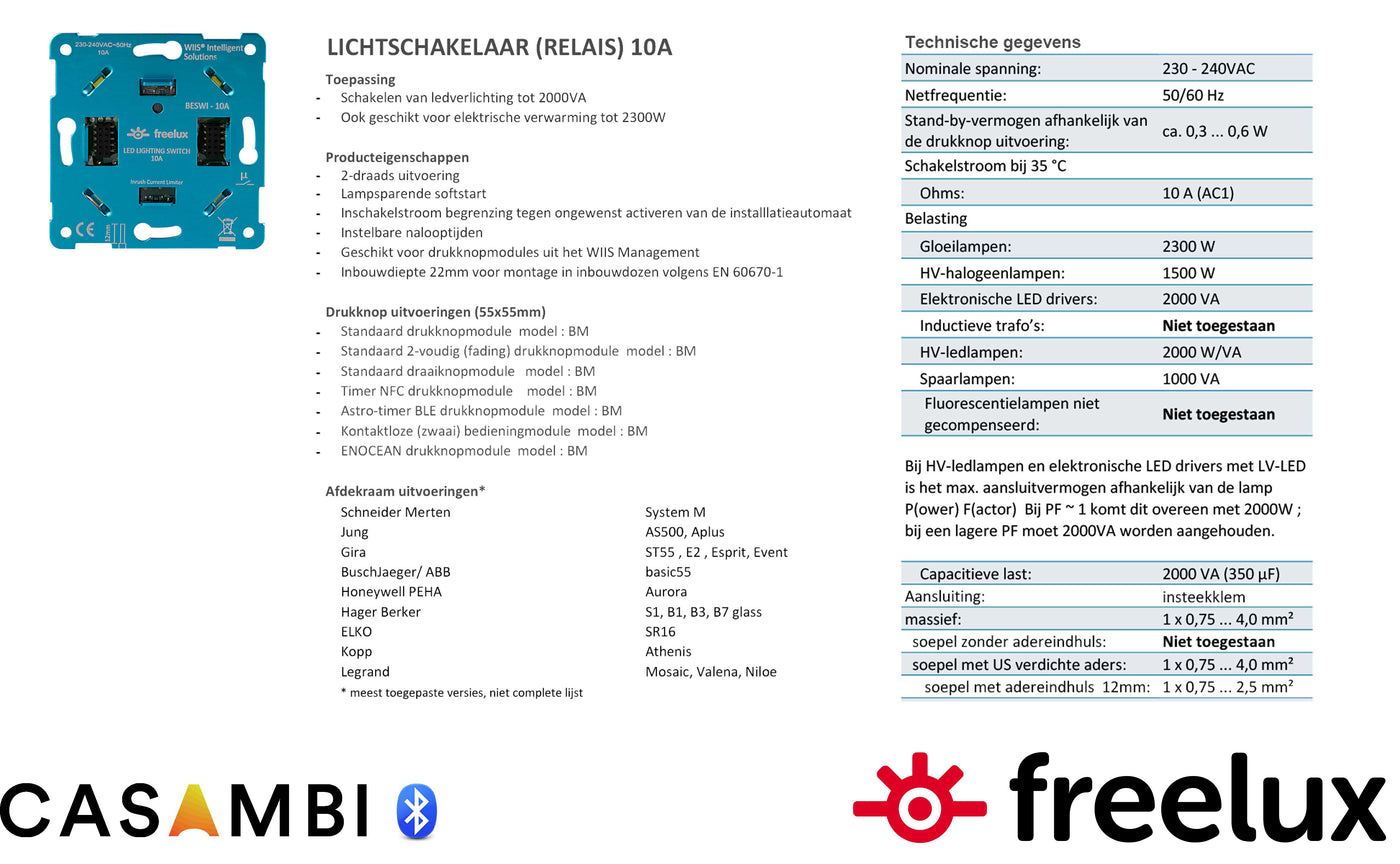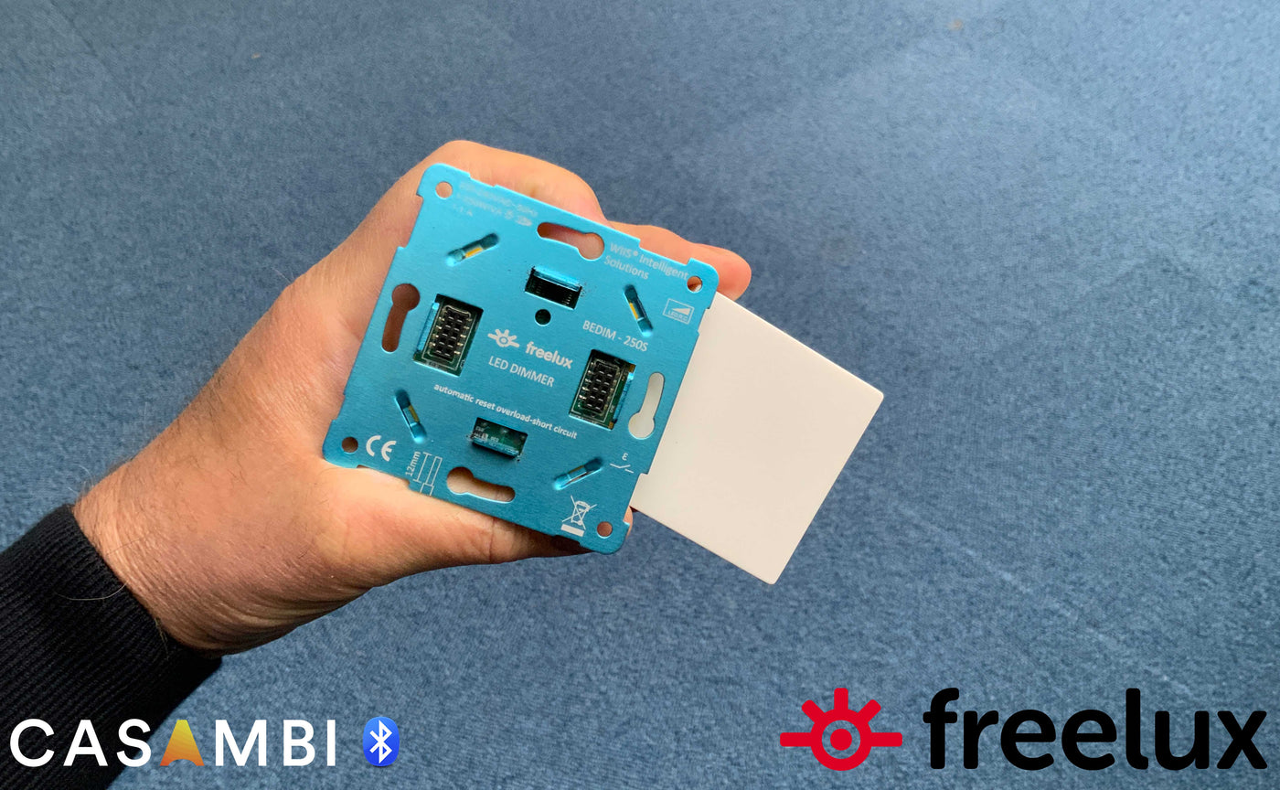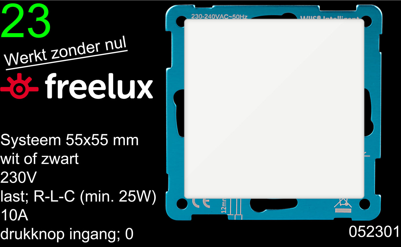 Freelux Casambi schakelcontacten werken zónder 0-draad en laten zich bedienen met een eenvlakswip. Ze zijn afgewerkt binnen de 55x55mm systemen hetgeen betekent dat ze tevens inzetbaar zijn in andere merken zoals GIRA, Jung A series enz. Opmerkelijk detail is dat de Casambi technologie in de plastic drukknop zélf zit en dus NIET in het metalen basisdeel, daardoor zijn de repeater eigenschappen uitmuntend!Het minimaal aangesloten vermogen dient 15 Watt te zijn.