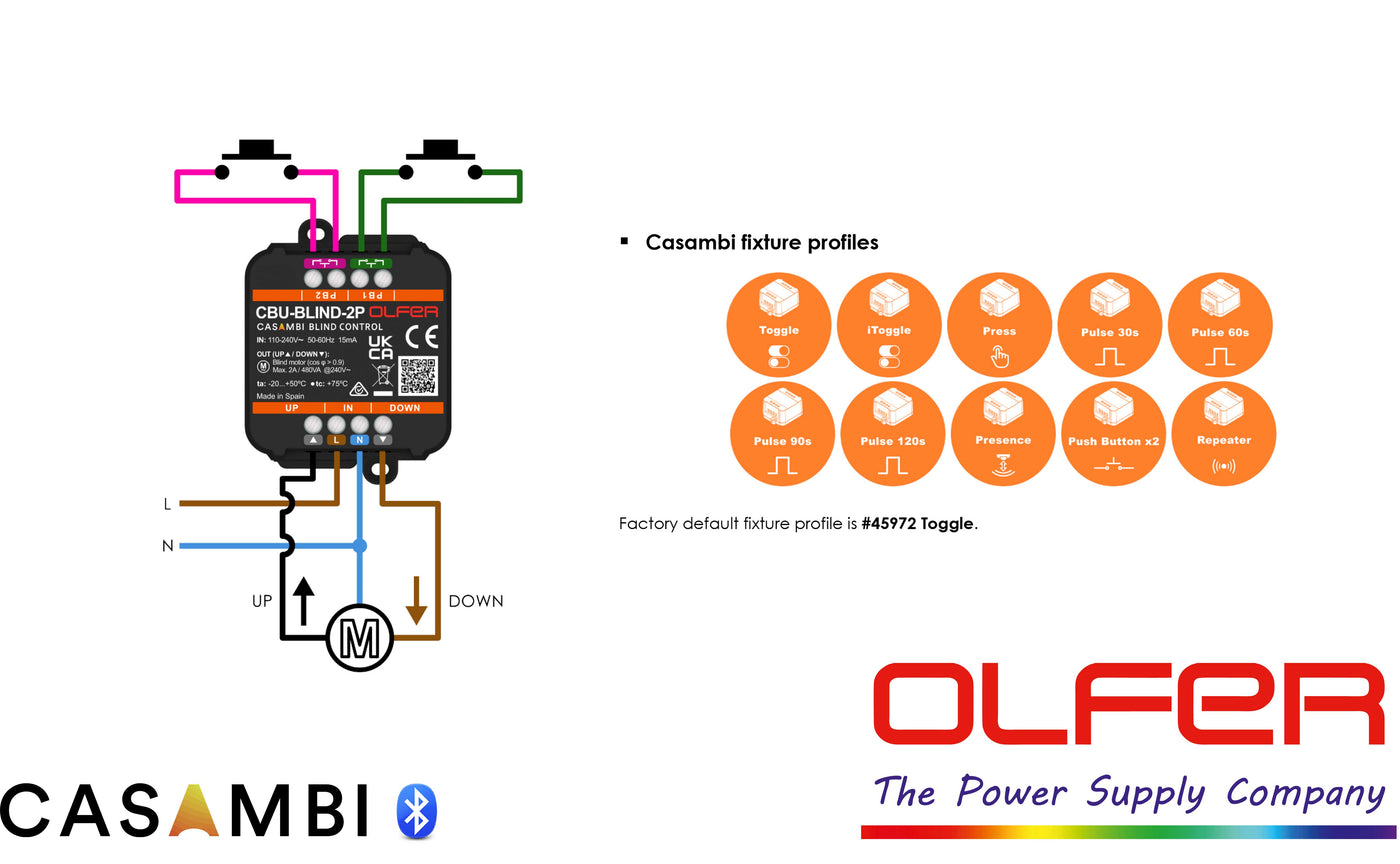 Er zijn verschillende profielen beschikbaar Toggle, Independent Toggle, Press, Pulse, enzovoort. De CBU-BLIND-2P beschikt daarnaast over twee onafhankelijke drukknopingangen voor het bedienen van de rolluikmotor of andere Casambi-apparaten.