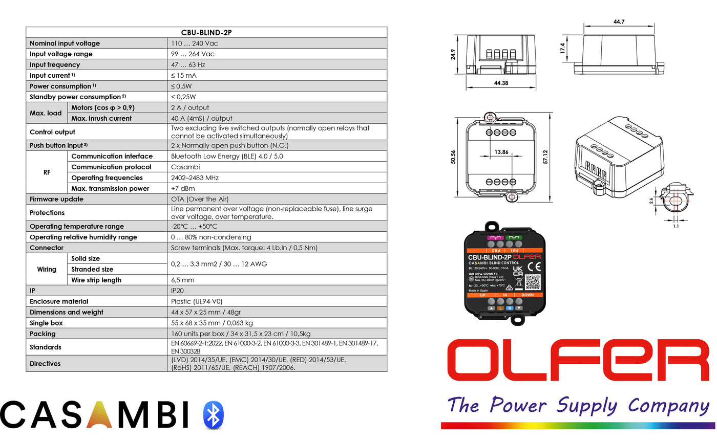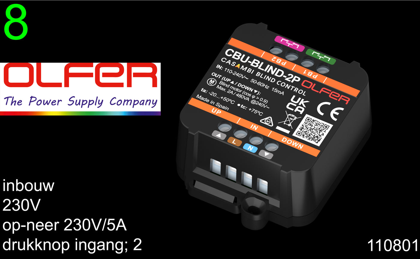 CBU-BLIND-2P heeft twee onderling vergrendelde geschakelde uitgangen voor het aansturen van motoren tot 2A, waarmee AC-gevoede motoren van 110 tot 240 Vac kunnen worden geregeld.