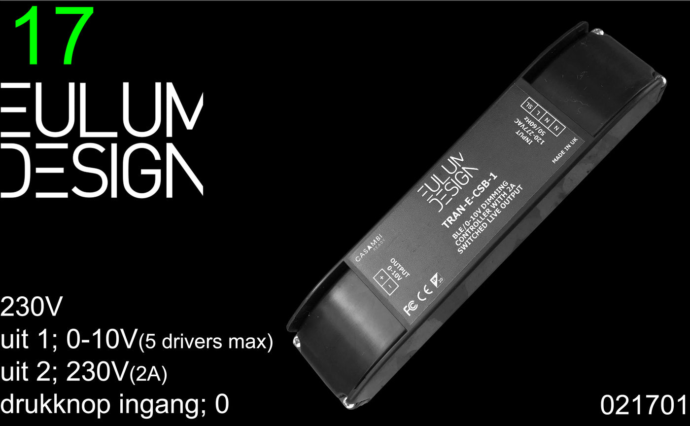 Eulum Interface dat vanuit het Casambi netwerk een 0-10V signaal genereert. Om uw LED-drivers met 230V te voeden is er in de behuizing al een relais voorhanden waarop u  230V krijgt aangeboden vanaf opgaande 1% dimwaarde. Het 0-10V signaal is krachtig genoeg om tot 5 drivers tegelijk aan te sturen.