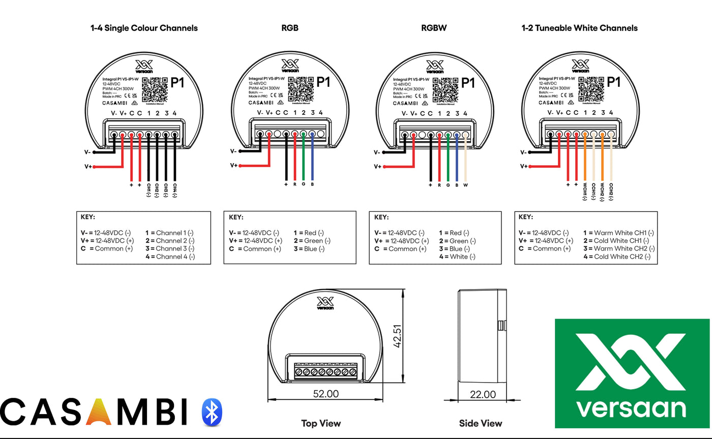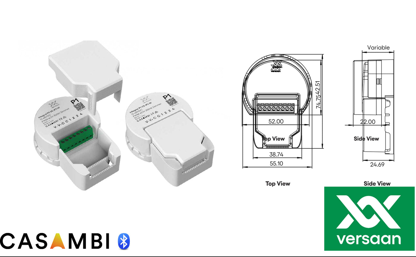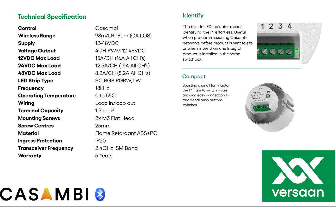 Integral P1 is een kleine PWM4 inbouw ledstrip dimmer van 300W. Er zijn meerdere profielen voorhanden. U mag een ledstripvermogen van 300W aansluiten en deze over de de kanalen verdelen, maar een enkele belasting van 300W op kanaal 1 (1xdim) mag ook, maar let dan op dat de unit niet opgesloten of onder een isolatiedeken ligt ivm warmte afgifte.