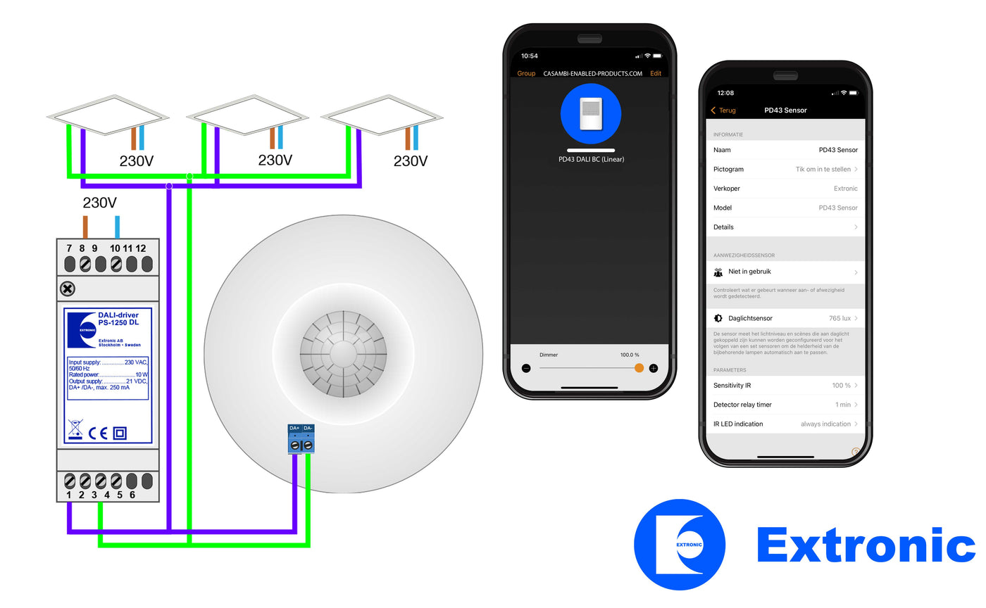 41) In het profiel 'PD43 DALI BC (Logaritmic)' komt de sensor én in het lampenveld én in het 'Sensoren' veld terecht. De aangesloten DALI toestellen dimmen alle tegelijk op en af, er is dus maar 1 dimslider die logaritmisch dimt. Merk op dat u de DALI groep zelfs aan een scene kunt koppelen die opgeroepen wordt door de sensor zélf, u kunt op deze manier dus een slimme Casambi stand-alone omgeving maken.