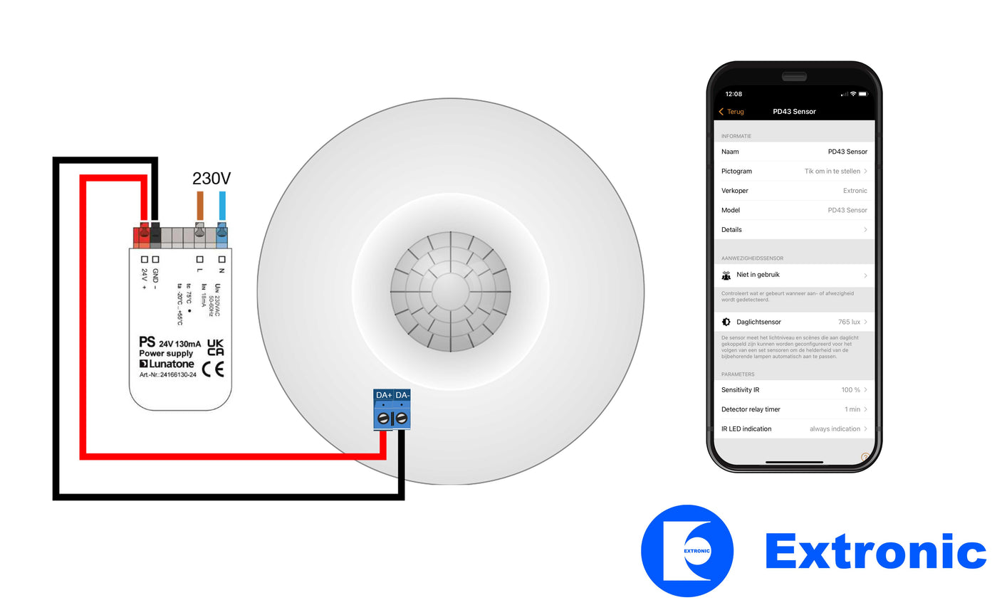 In dit geval gedraagt de sensor zich tevens als Gateway. De sensor werking blijft bestaan. De extra schakelende uitgang van de sensor blijft ook werken (0-60min), echter is die niet meer te bedienen vanuit het lampenveld.