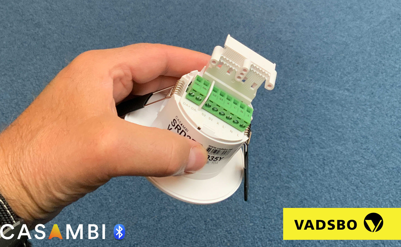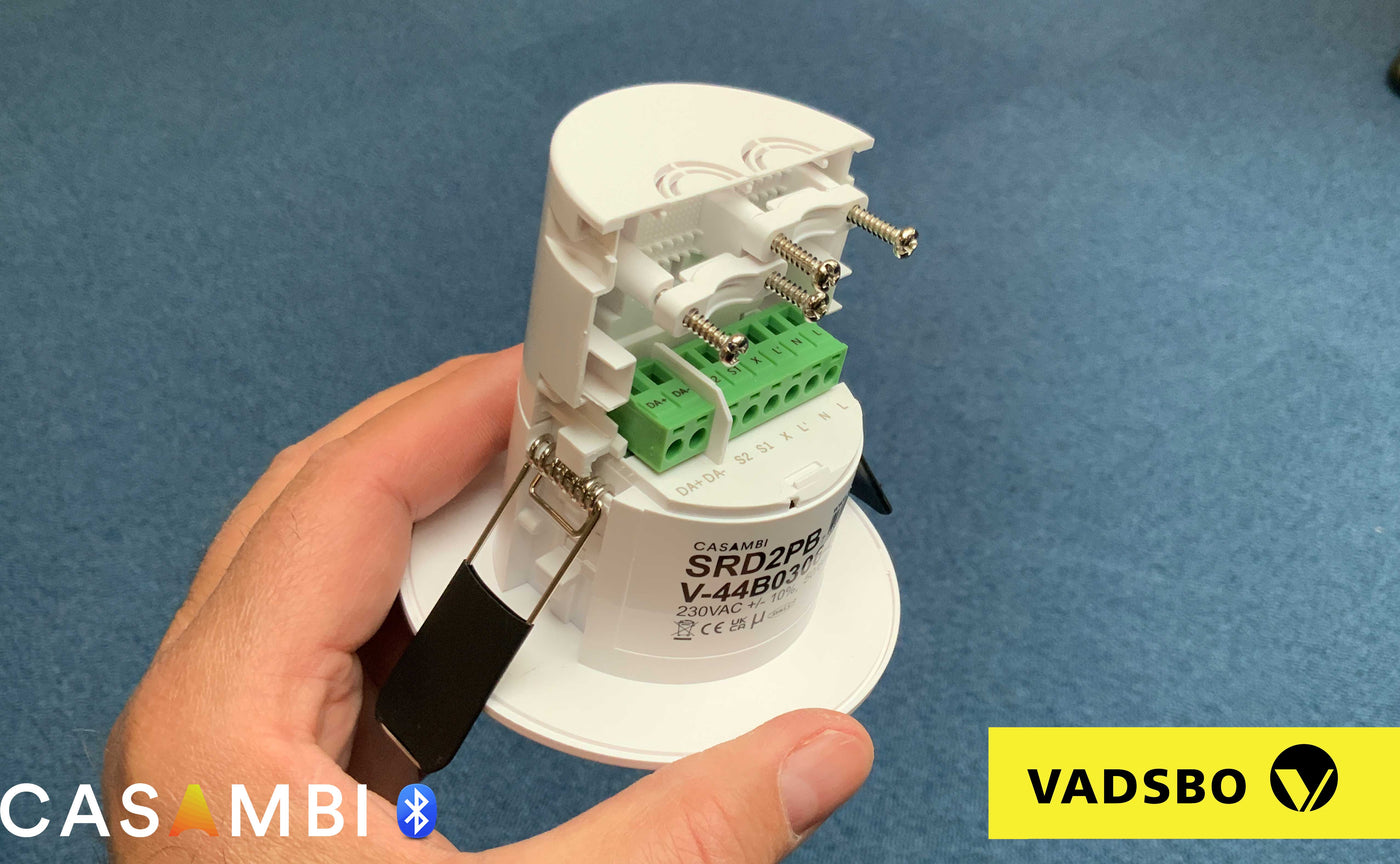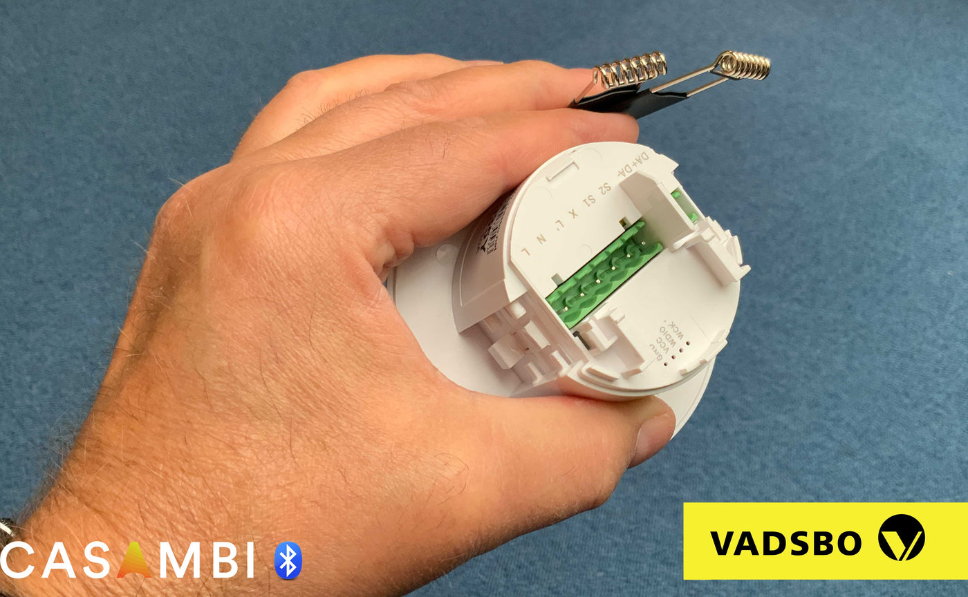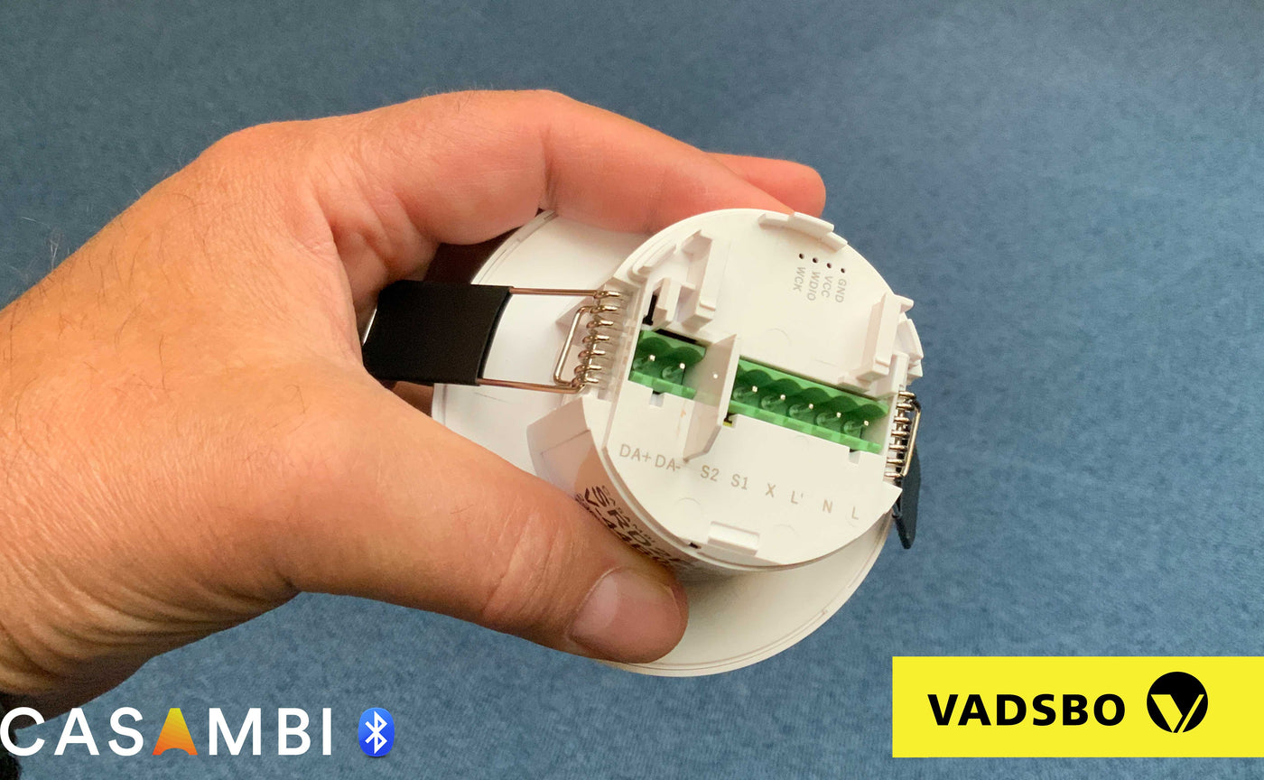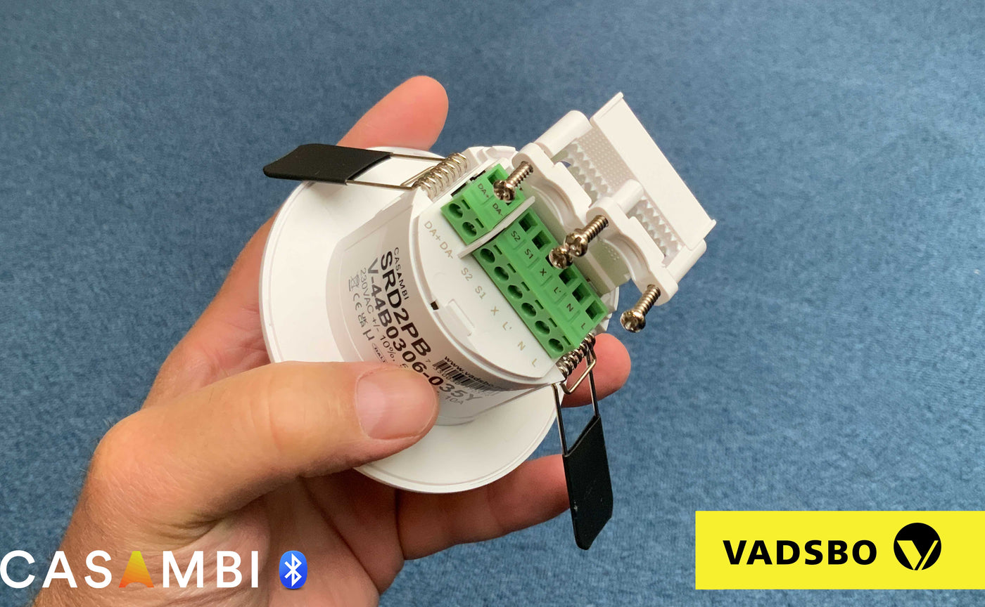 Vadsbo Casambi PIR-sensor met DALI- en relaisuitgang en twee drukknopingangen.