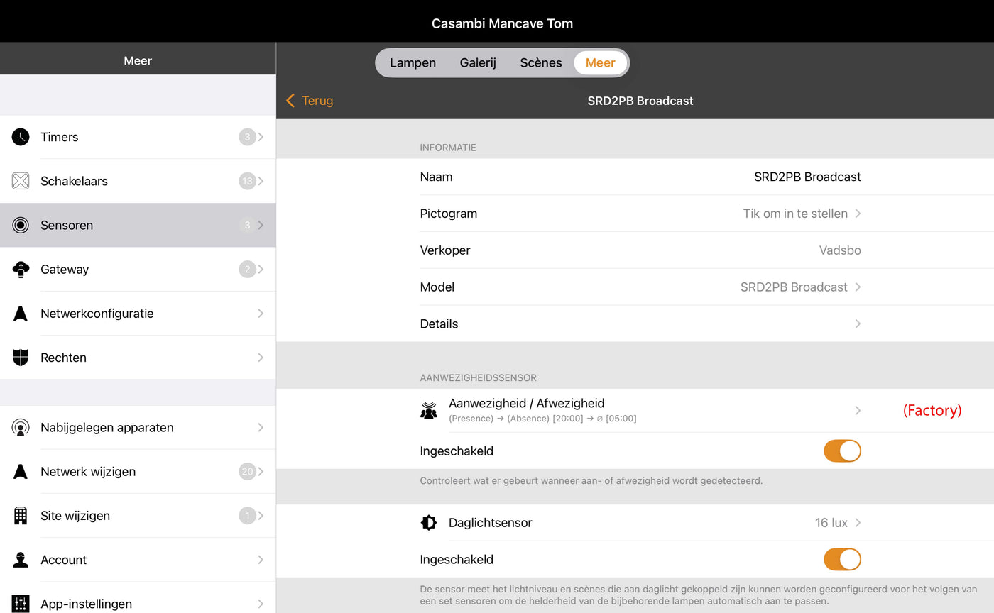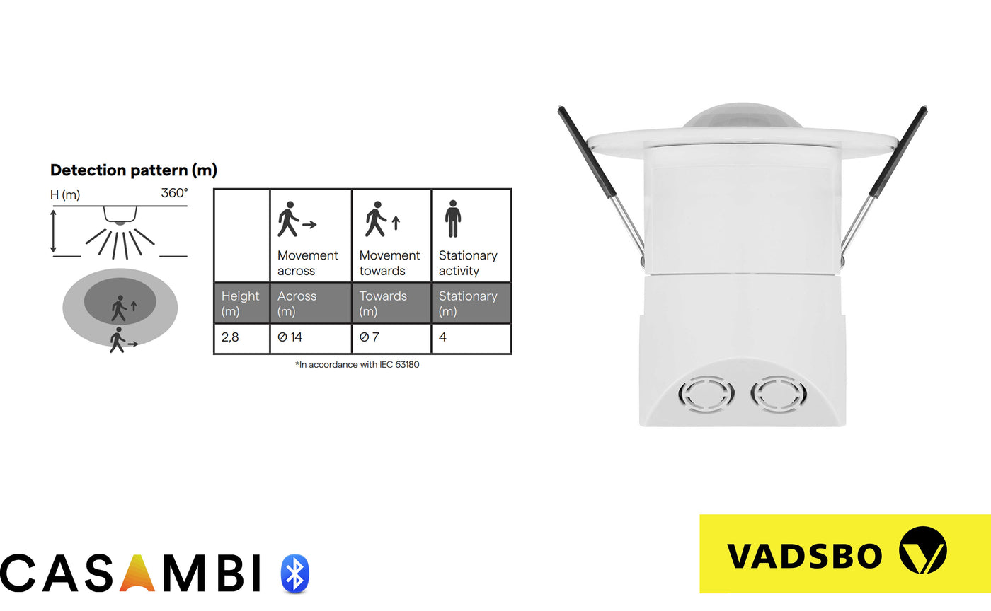 De sensor wordt geleverd met vooraf ingestelde Casambi instellingen waardoor deze direct na het aansluiten functioneert, deze functies kunnen eenvoudig worden aangepast via de Casambi-app.